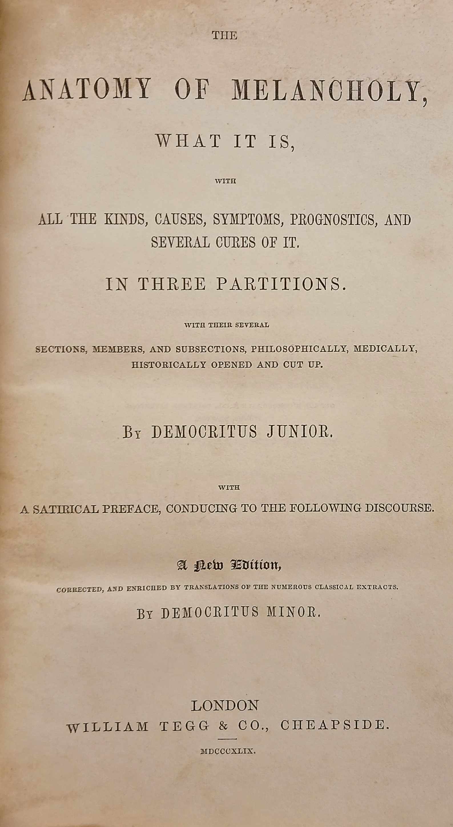A copy of ‘The Anatomy of Melancholy, What it is, With all the kinds, causes, symptoms, prognostics, and several cures of it. / In three partitions. / With their several sections, members, and subsections, philosophically, medicinally, historically opened and cut up / by Democritus Junior’ (London: William Tegg & Co., MDCCCXLIX [1849]).