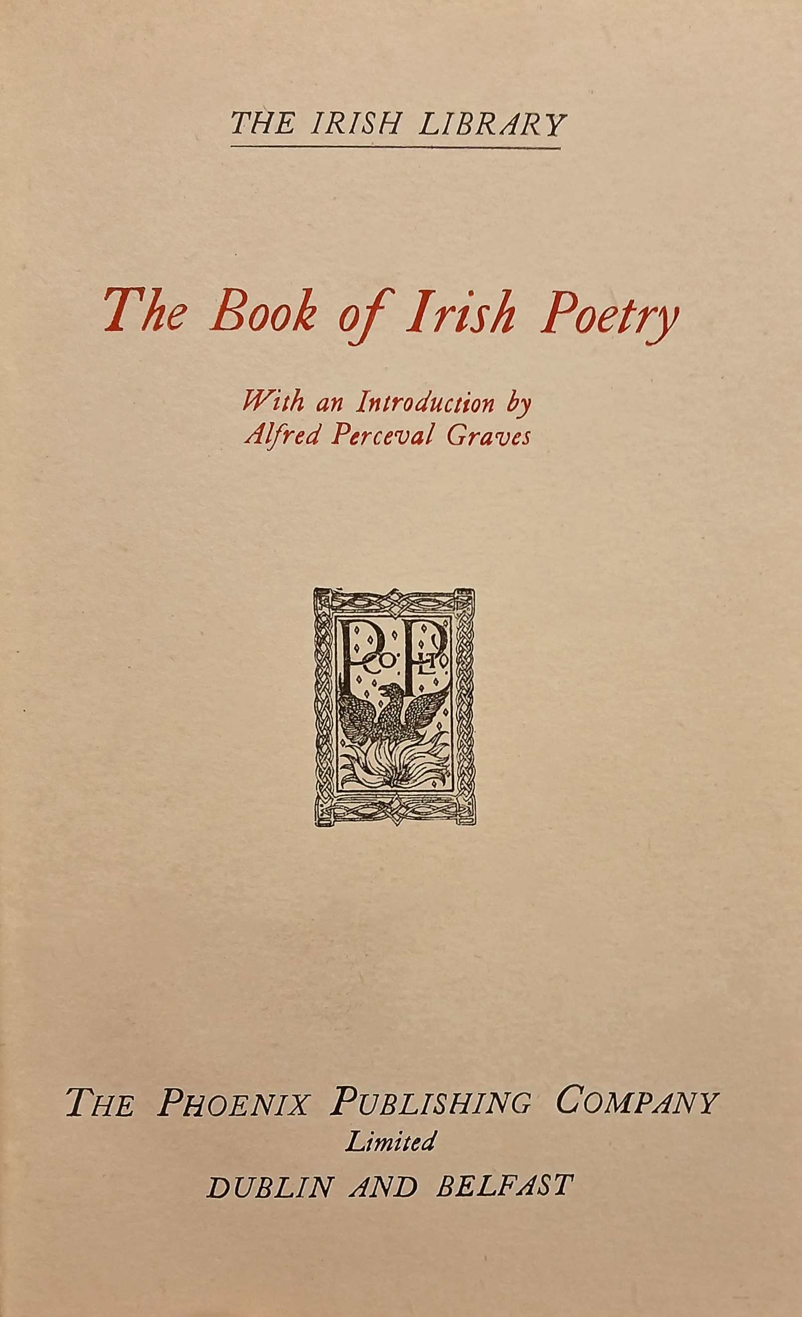 A copy of ‘The book of Irish poetry / edited with an introduction by Alfred Perceval Graves’ (Dublin and Belfast: The Phoenix Publishing Company, [c.1916]).