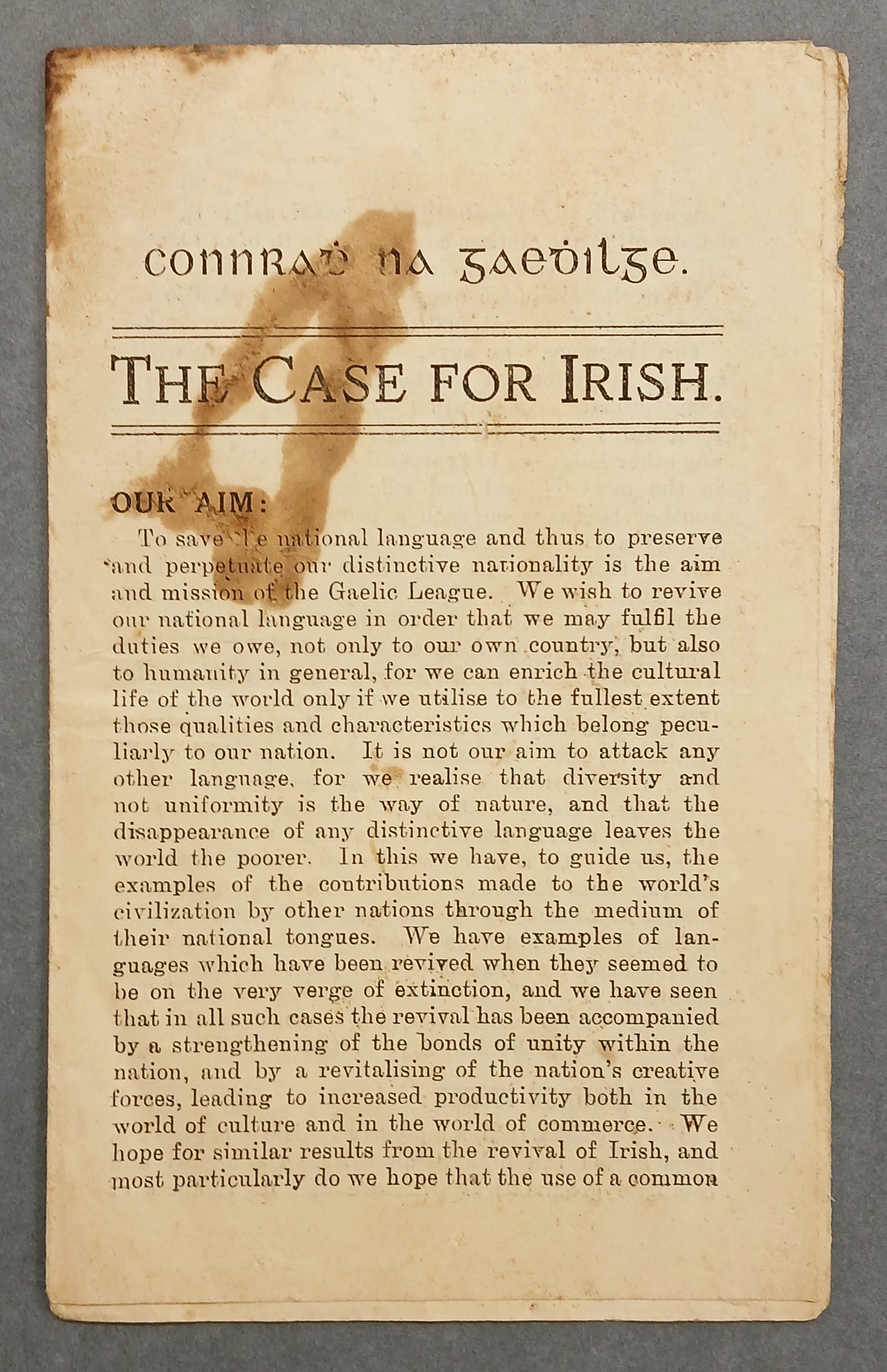 A copy of ‘The case for Irish’ ([Baile Átha Cliath: Connradh na Gaedhilge, c.1920]). Printed by the Powell Press in Dublin.