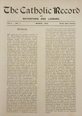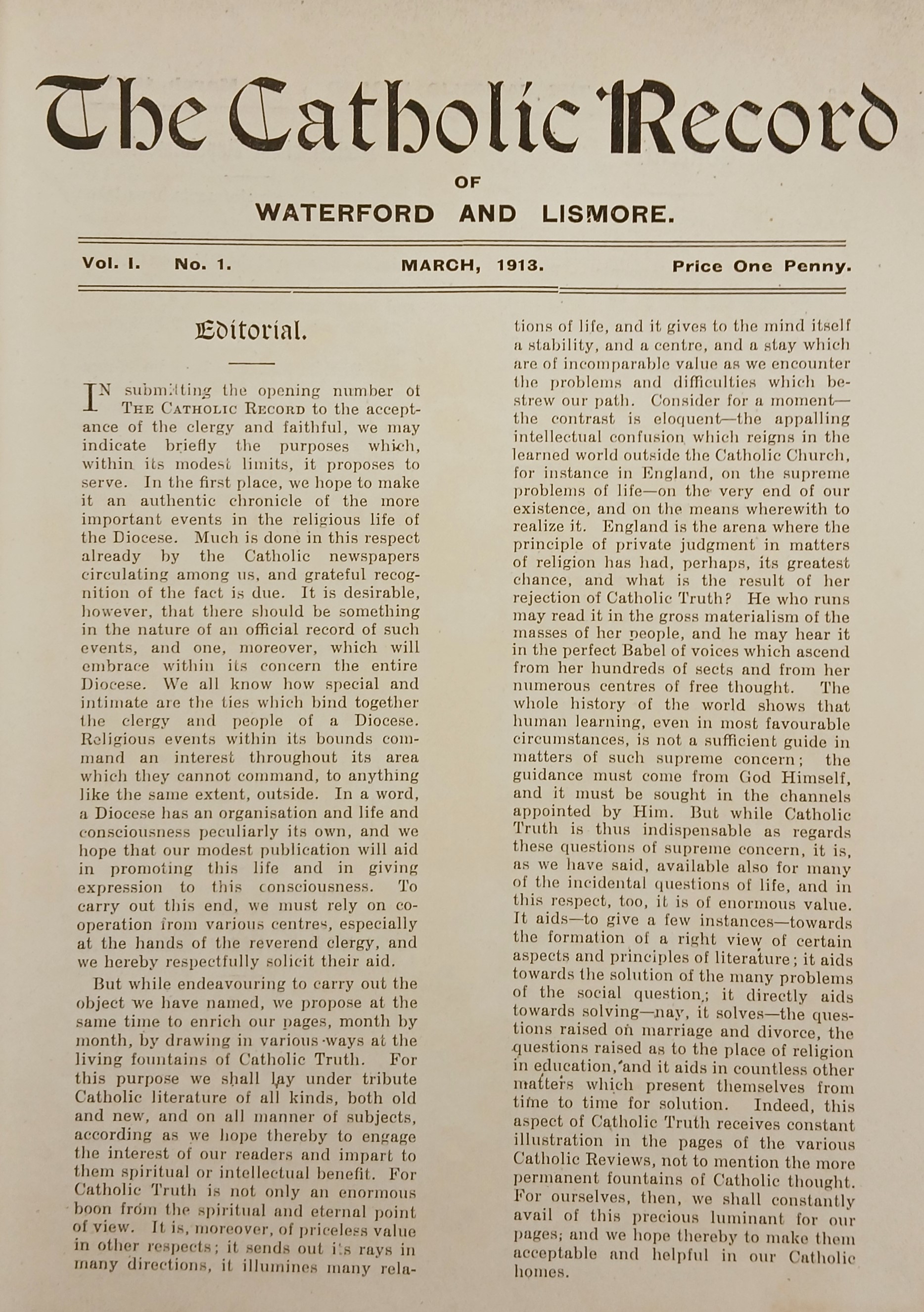 A bound copy of ‘The Catholic Record of Waterford and Lismore’ Vol. 1, No. 1 (March 1913) to Vol 1., No. 12 (February 1914). Printed and published by ‘The Munster Express’.