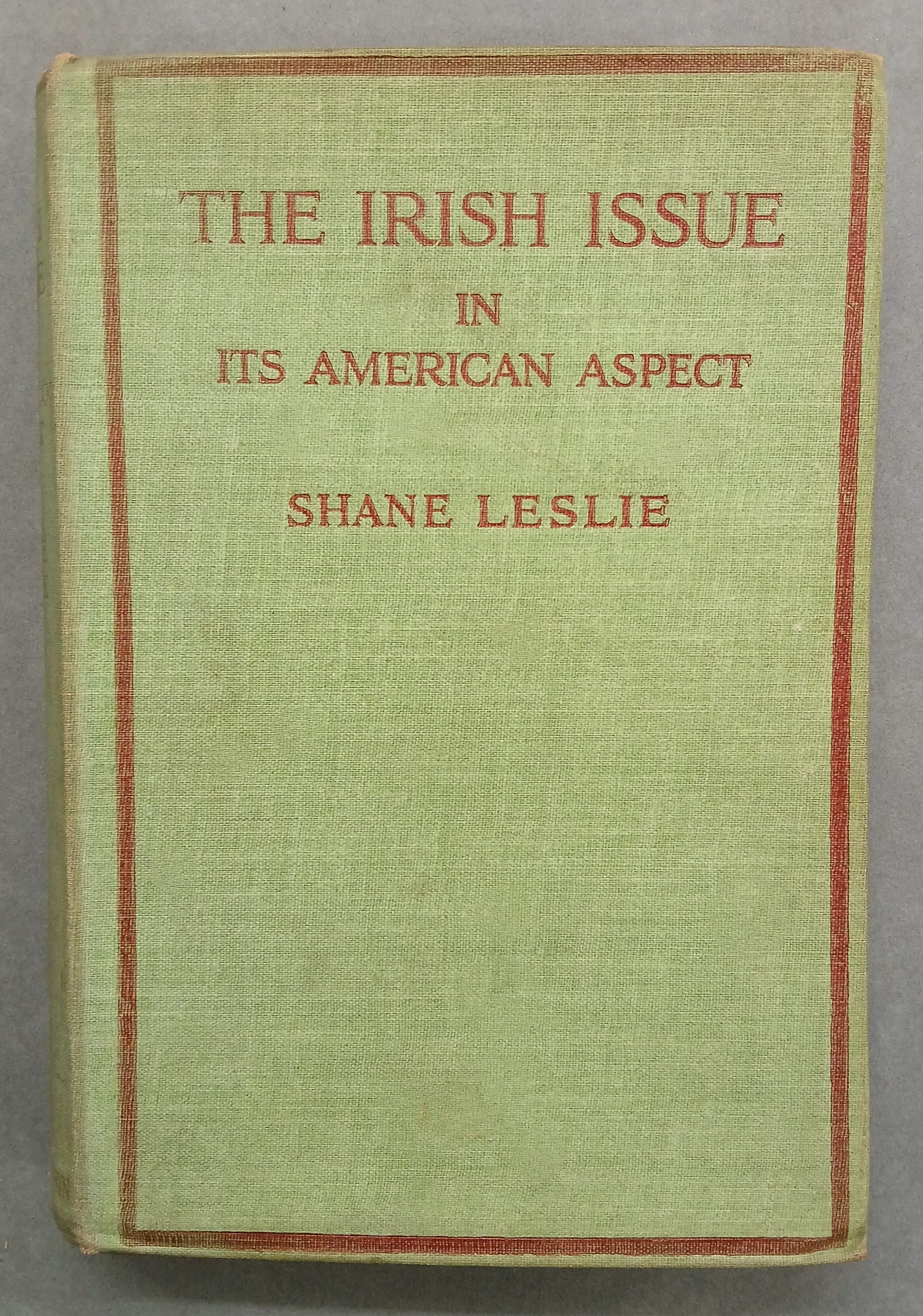 A copy of Shane Leslie, ‘The Irish issue in its American aspect / a contribution to the settlement of Anglo-American relations during and after the great war’ (London: T. Fisher Unwin, 1918).