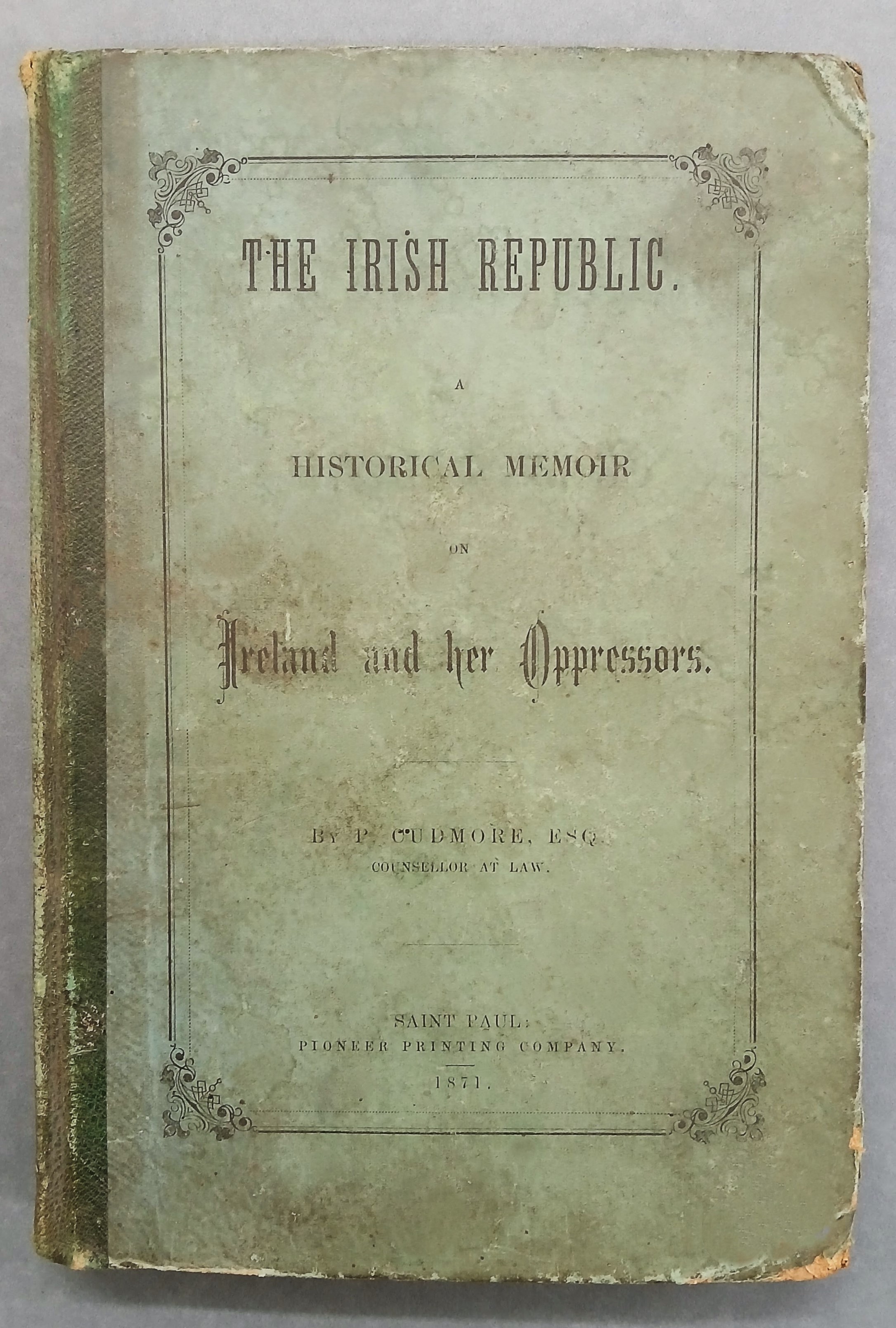A copy of Patrick Cudmore, ‘The Irish republic / A historical memoir on Ireland and her oppressors’ (Saint Paul: Pioneer Printing Co., 1871).