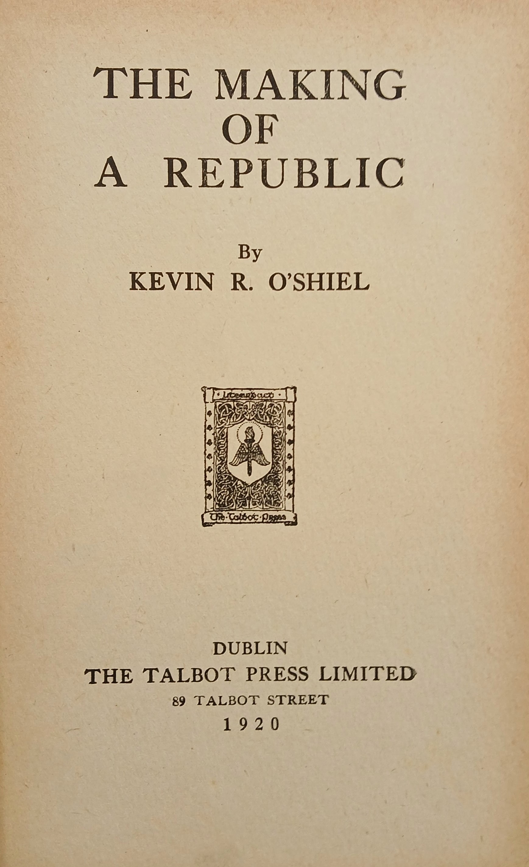 A copy of Kevin R. O’Shiel, ‘The making of republic’ (Dublin: Talbot Press, 1920). The book includes a chapter on the role played by Irishmen in the American struggle for independence.