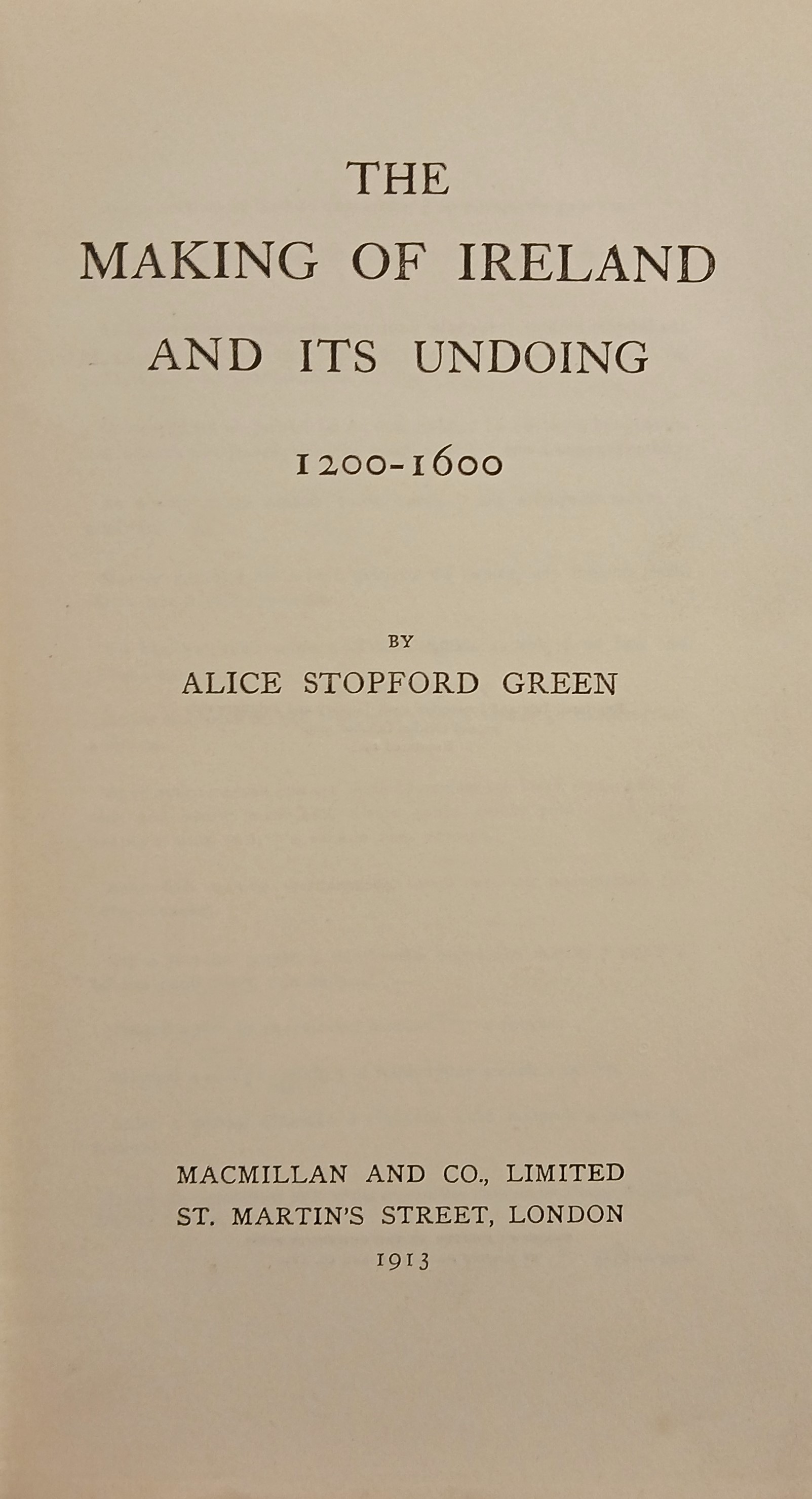 A copy of Alice Stopford Green, ‘The making of Ireland and its undoing, 1200-1600’ (London: MacMillian & Son Limited, 1913).