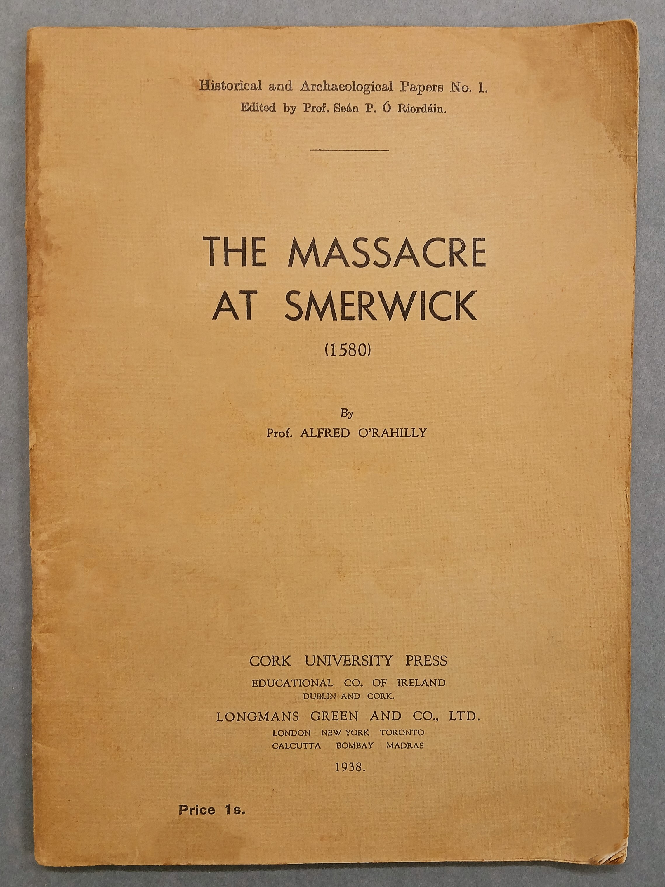A copy of Prof. Alfred O’Rahilly, ‘The massacre at Smerwick (1580) … First printed in the “Journal of the Cork Historical and Archaeological Society”, XLII (1937), nos. 155 and 156’ (Cork: University Press, Educational Company of Ireland/Longmans, Green and Company, Ltd., 1938).