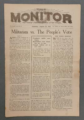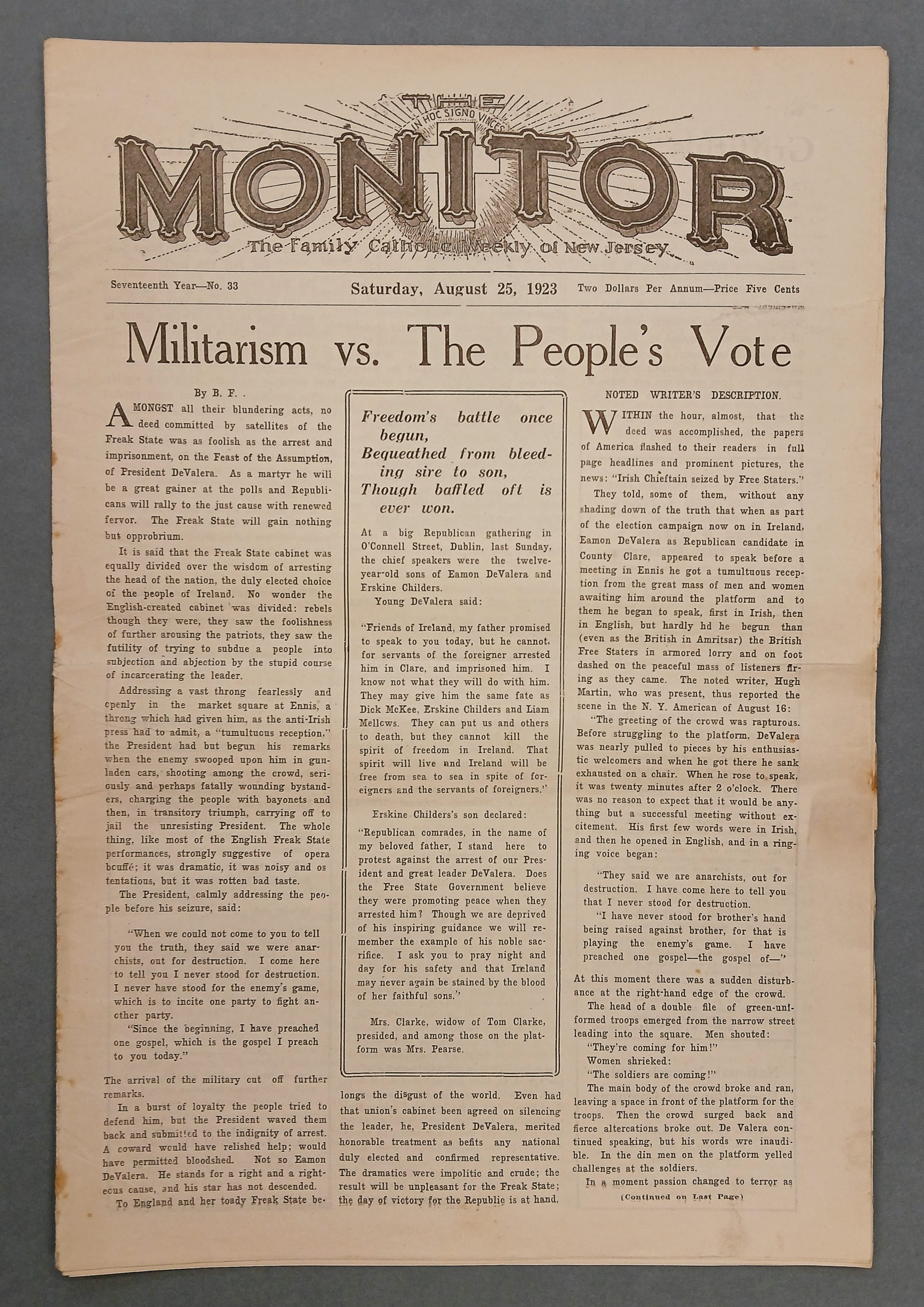 A copy of ‘The Monitor / Catholic Weekly of New Jersey’, No. 33 (25 August 1923). ‘The Monitor’ was a weekly magazine published by the Catholic Diocese of Trenton, New Jersey, in the United States. The edition includes commentary on the political situation in Ireland (written from a republican and anti-treaty perspective).