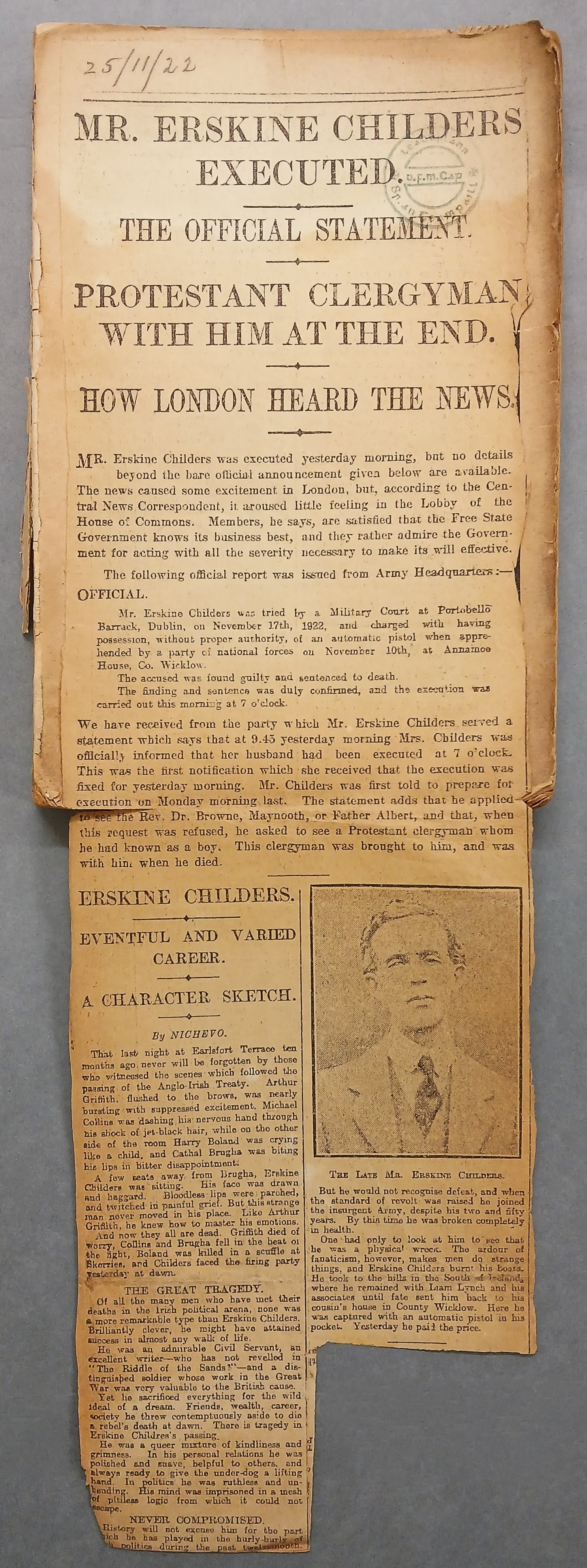 A copy of Erskine Childers, ‘The riddle of the sands / a record of the secret service’ (London: George Newnes Limited, [c.1922]). A newspaper clipping of an article reporting on the execution of Erskine Childers in Beggars Bush Barracks in Dublin (24 November 1922) is pasted into the front of the volume. The clipping is seemingly taken from the (London) ‘Herald’ (25 November 1922). The article refers to the request made by Childers to see Fr. Albert Bibby OFM Cap. before his execution.