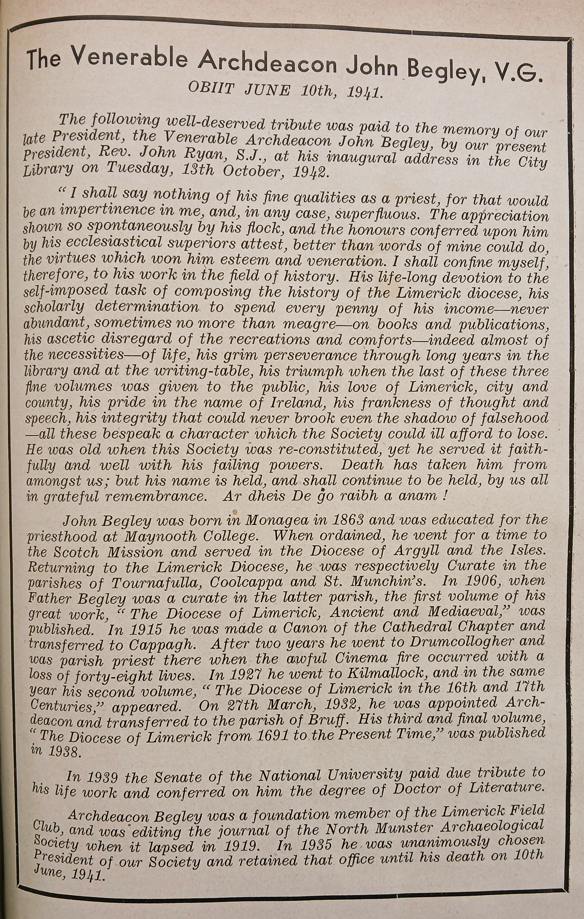An obituary for Archdeacon John Begley, the author of a history of the diocese of Limerick, who died on 10 June 1941.