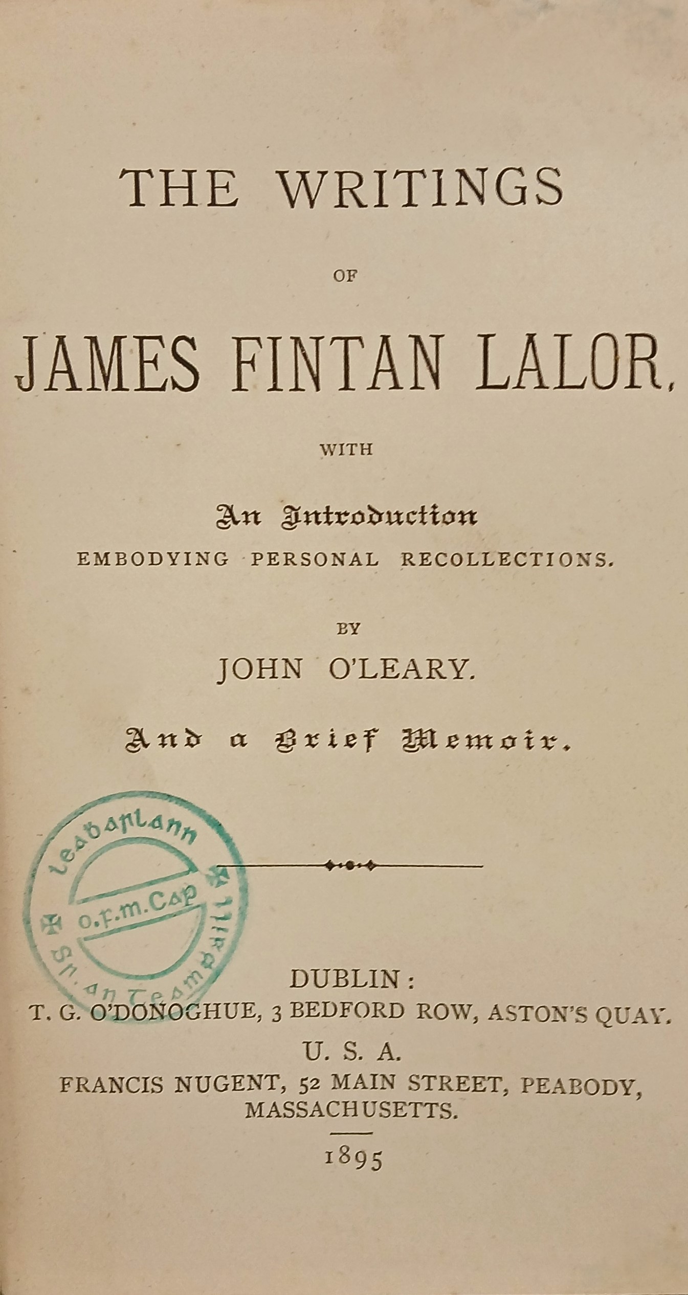 A copy of ‘The writings of James Fintan Lalor / with an introduction embodying personal recollections by John O’Leary and a brief memoir’ (Dublin/Peabody, Massachusetts: Francis Nugent and T.G. O’Donoghue, 1895).