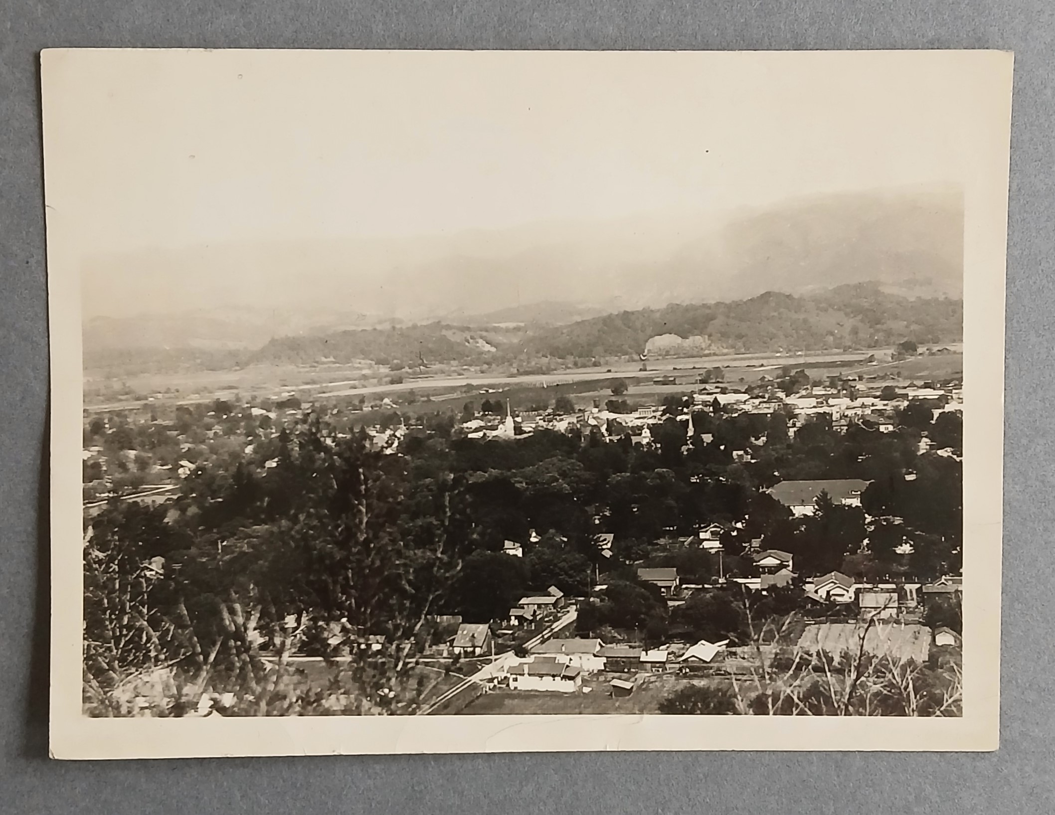 Photograph of the town of Ukiah, Mendocino County, California, taken from a nearby hill. A manuscript annotation on the reverse reads ‘Ukiah’.