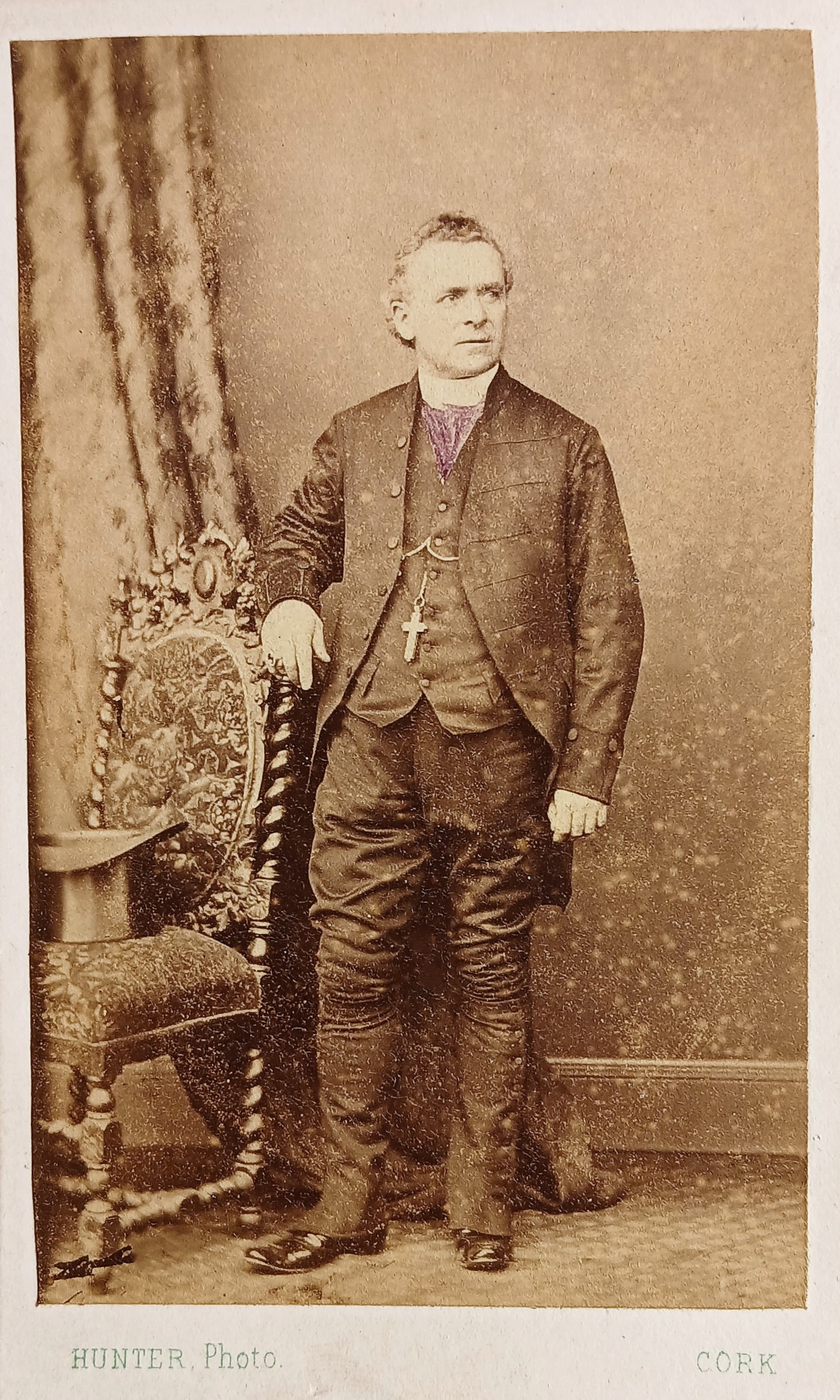 A carte de visite of an unidentified priest. The carte was printed by H. Hunter, 61 South Mall and 102 Patrick Street, Cork.