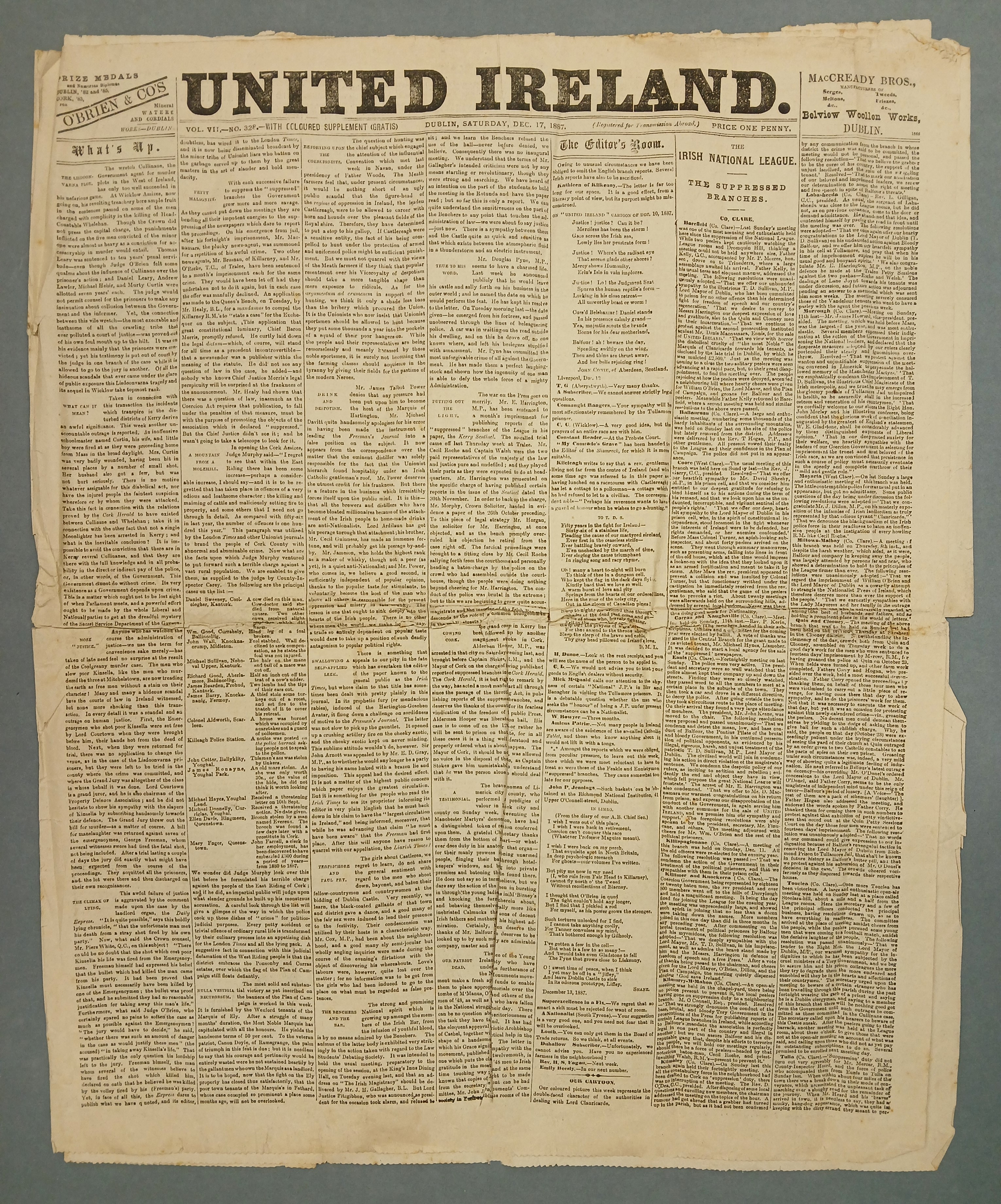 A copy of ‘United Ireland’, Vol. VII, No. 328 (17 December 1887). The edition includes articles on the Plan of Campaign and accounts of tenant agitation around the country.