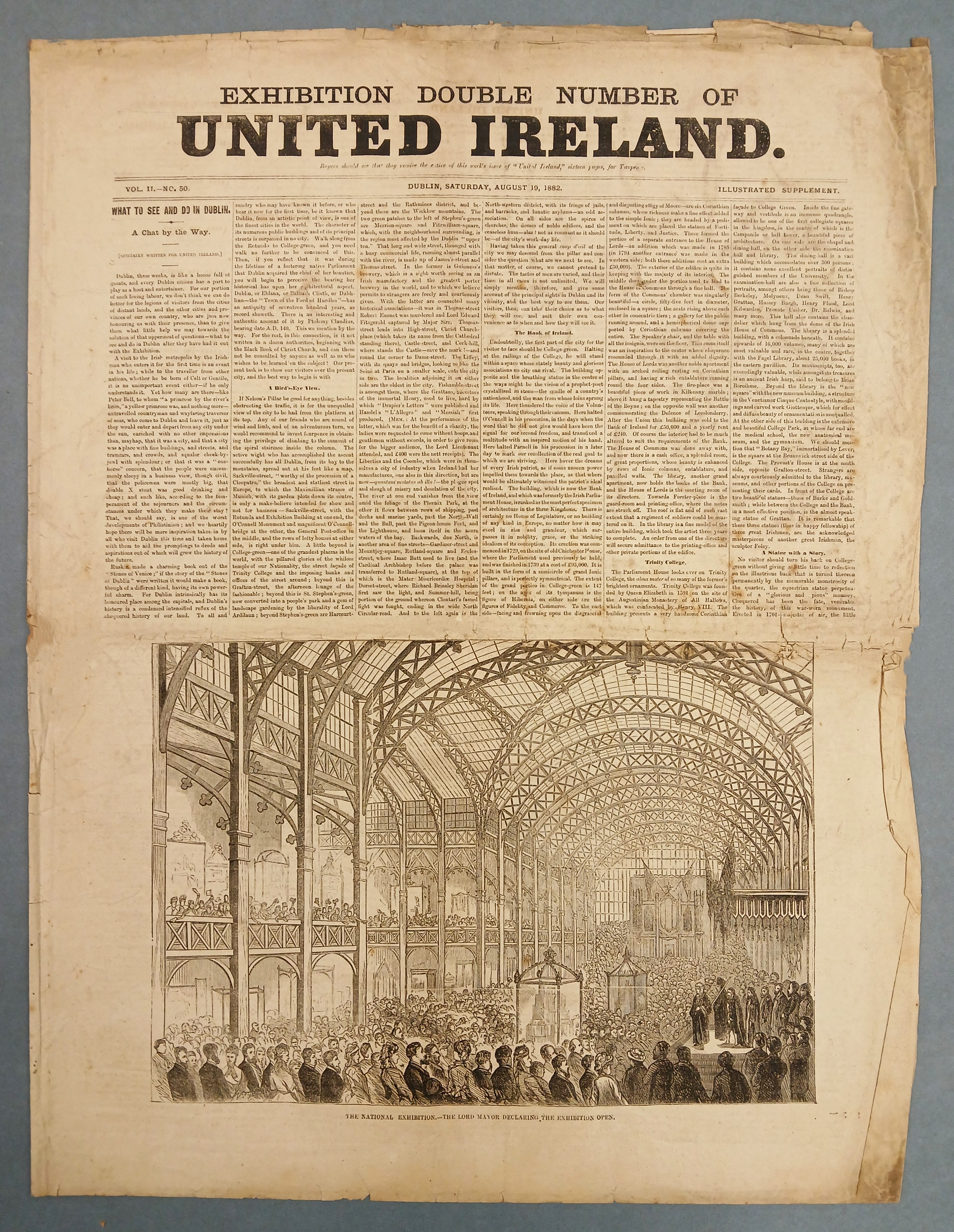 A copy of ‘United Ireland’, Vol. II, No. 50 (19 August 1882). The edition is a special supplement covering the National Exhibition of Irish Manufactures held in Dublin.