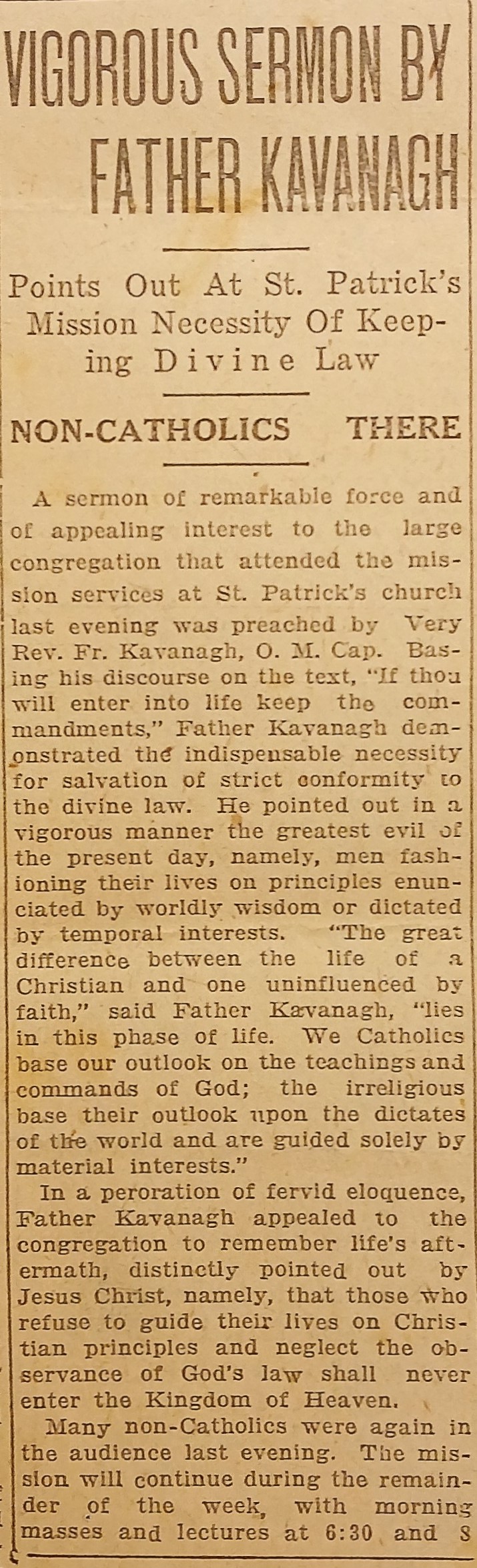 A clipping of an article reporting on a sermon delivered by Fr. Stanislaus Kavanagh OFM Cap. during a religious mission at St. Patrick’s Church in York, Pennsylvania. The clipping is taken from ‘The Gazette and Daily’, York, Pennsylvania (11 March 1925).