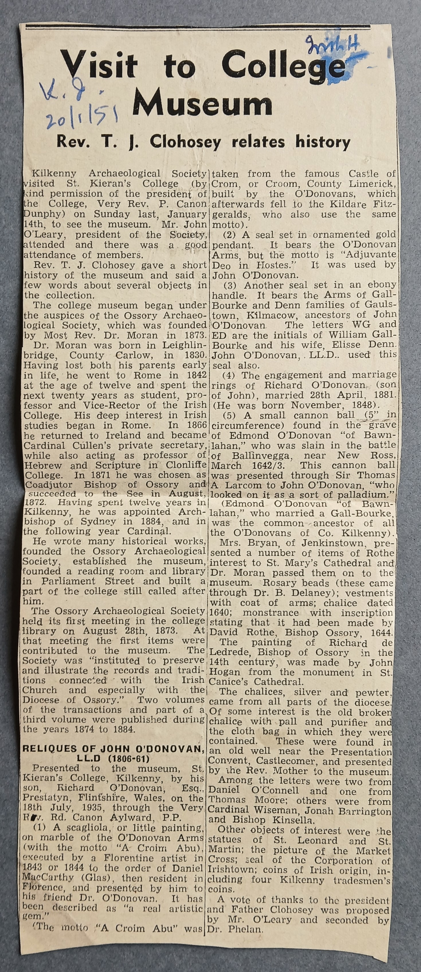 A clipping of an article by Rev. T.J. Clohosey titled ‘Visit to College Museum’, published in the ‘Kilkenny Journal’ (20 January 1951).